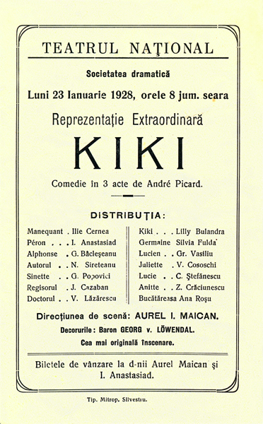 "Kiki" by Andre Picard directed by Aurel Ion Maican the National Theatre of Cernauti, 1928 |